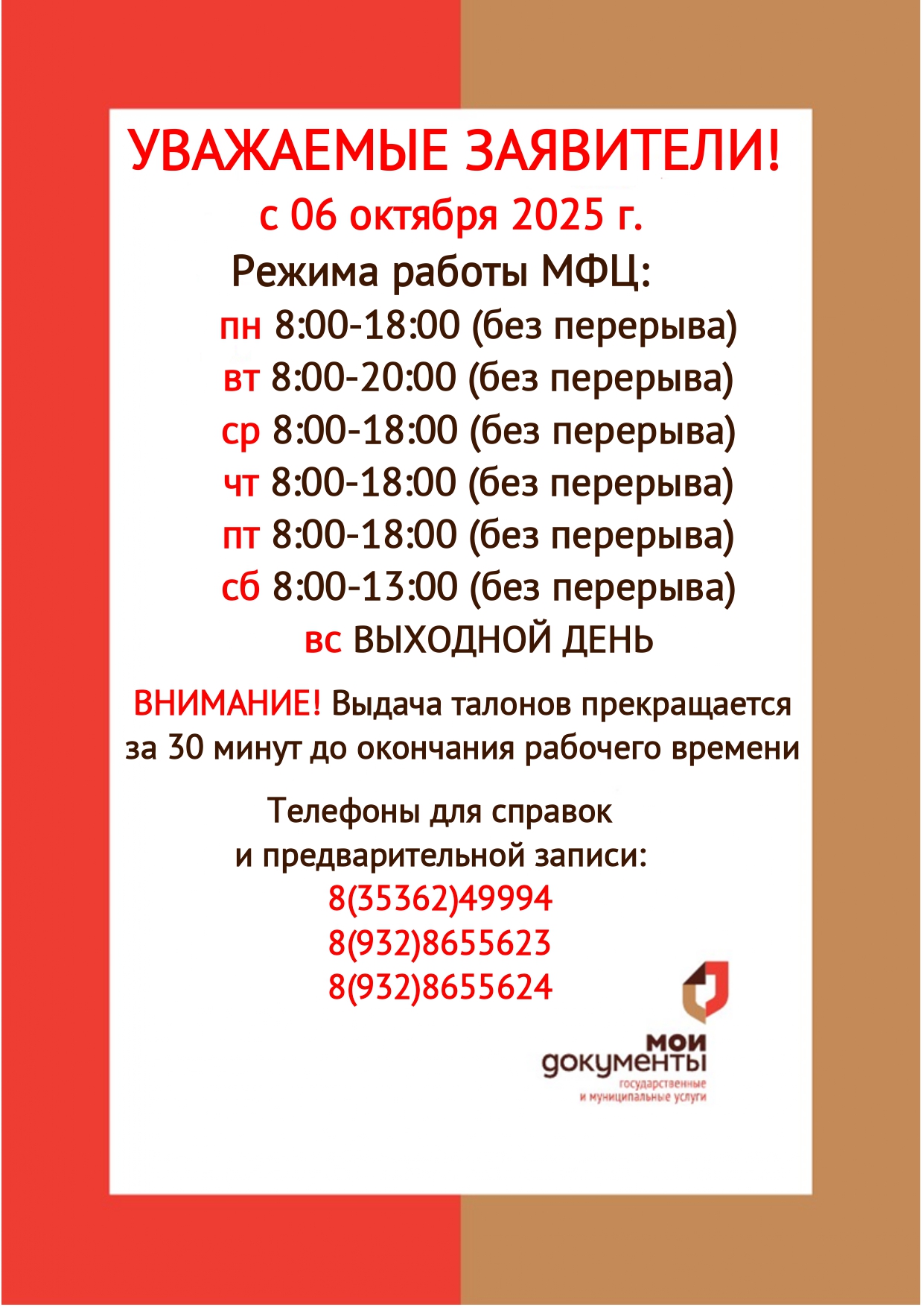 с 06 октября 2025 г.: пн 8:00-18:00 (без перерыва) вт 8:00-20:00 (без перерыва) ср 8:00-18:00 (без перерыва) чт 8:00-18:00 (без перерыва) пт 8:00-18:00 (без перерыва) сб 8:00-13:00 (без перерыва) вс ВЫХОДНОЙ ДЕНЬ ВНИМАНИЕ! Выдача талонов прекращается за 30 минут до окончания рабочего времени! Телефоны для справок и предварительной записи: 8(35362)49994, 8(932)8655623, 8(932)8655624.