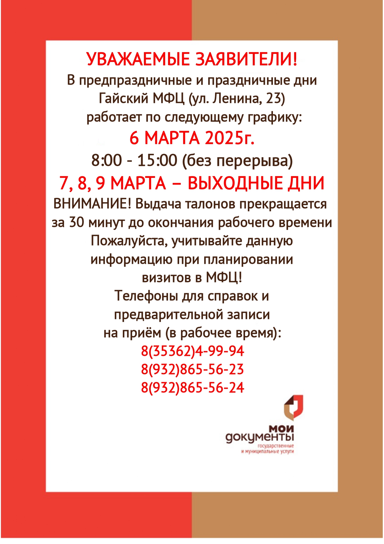 В предпраздничные и праздничные дни Гайский МФЦ (ул. Ленина, 23) работает по следующему графику: 6 МАРТА 2025г. 8:00 - 15:00 (без перерыва), 7, 8, 9 МАРТА – ВЫХОДНЫЕ ДНИ! ВНИМАНИЕ! Выдача талонов прекращается за 30 минут до окончания рабочего времени! Пожалуйста, учитывайте данную информацию при планировании визитов в МФЦ! Телефоны для справок и предварительной записи на приём (в рабочее время): 8(35362)4-99-94, 8(932)865-56-23, 8(932)865-56-24